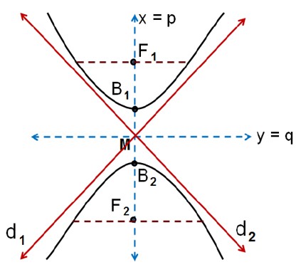 Sumbu utama ialah y = q dan sumbu sekawan ialah x = p